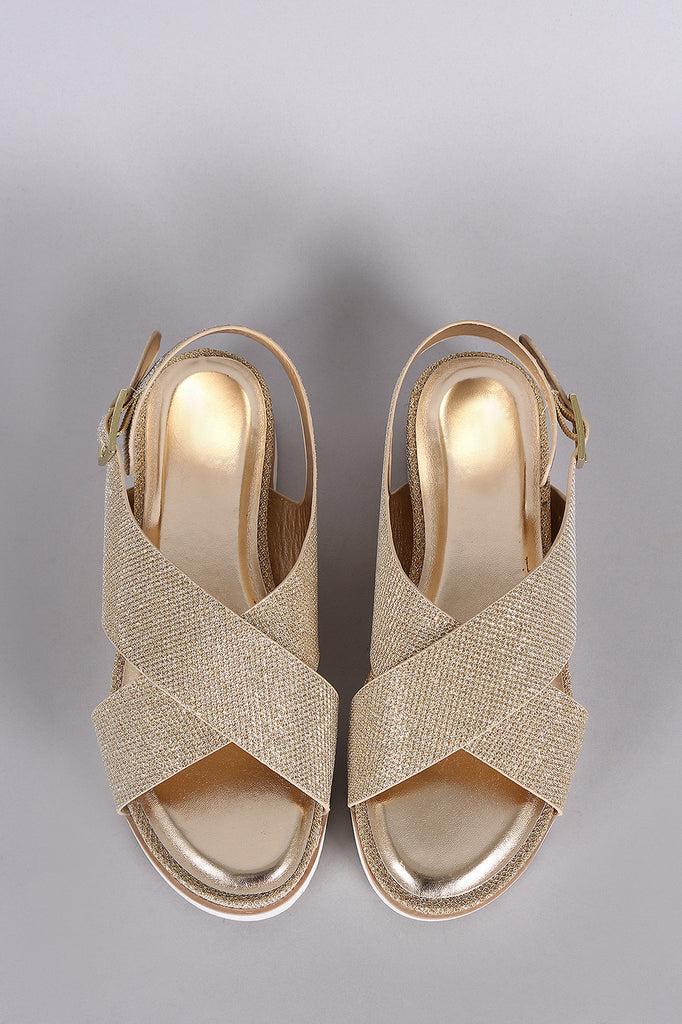 A glittery flat sandal featuring wide crossed straps, an open toe design, and a slingback strap with adjustable buckle closure. Sandal also features a chunky platform with lug sole and lightly padded insole.
