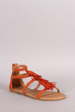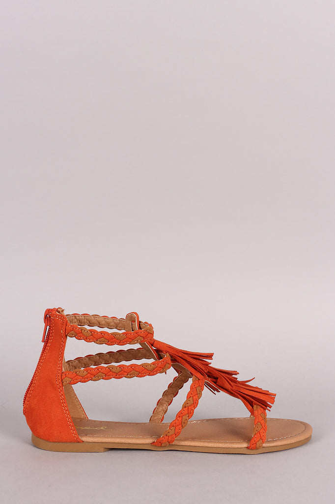 This chic sandal features an open toe silhouette, two-tone braided vamp straps adorned with tassels, lightly padded insole, and convenient back zip closure.