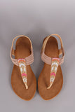 This gorgeous flat sandal features a t-strap with beaded chevron design, instep elasticized straps, and lightly padded insole.