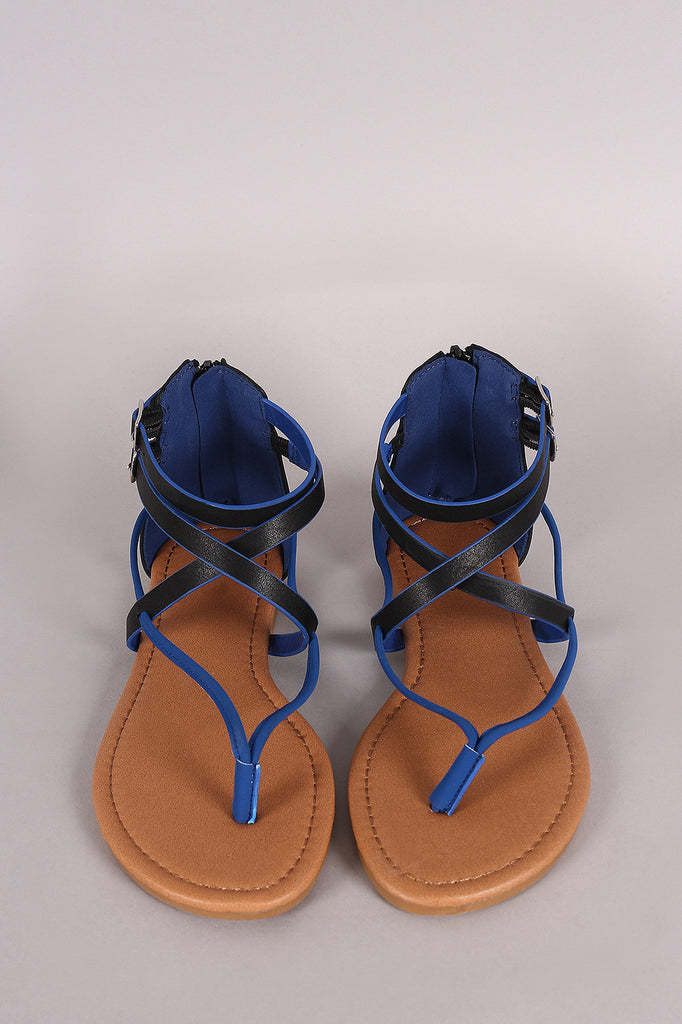 This delightful flat sandal features a thong construction, two tone intertwined straps with two side buckles accent, lightly padded insole, and convenient back-zip closure.