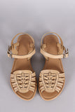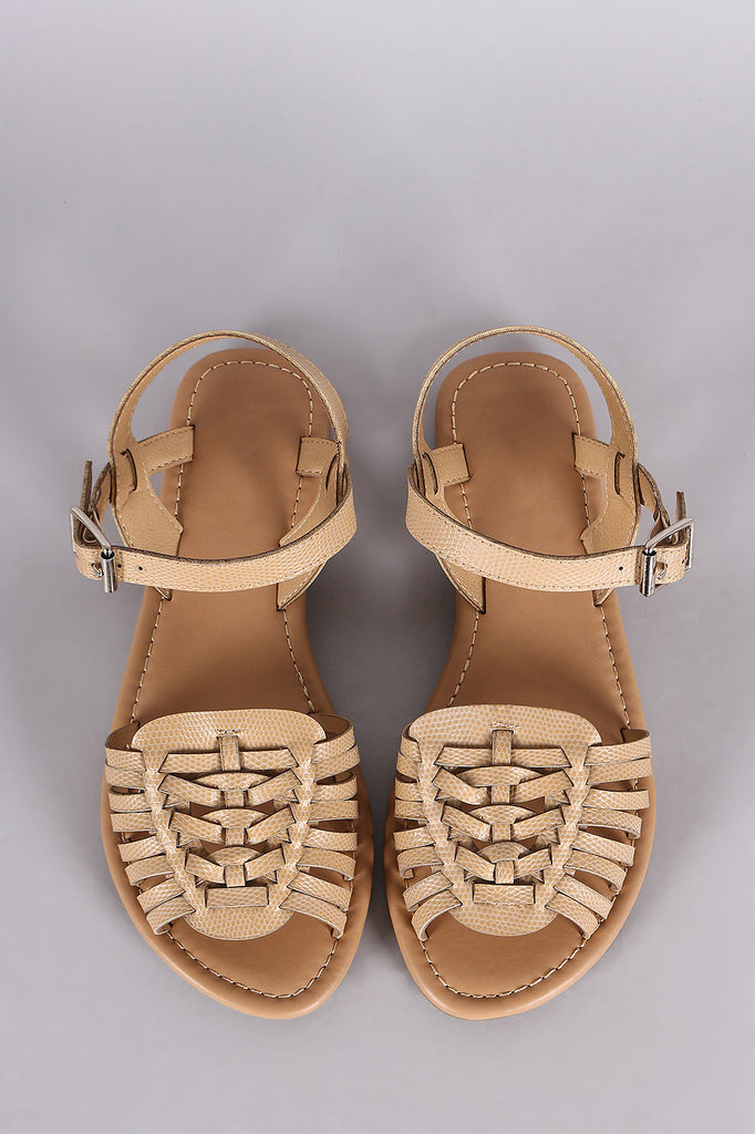 This cute sandal features a peep toe silhouette, lizard embossed detail, strappy woven design, lightly padded insole, and adjustable ankle strap with buckle fastening.