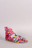 This flat sandal features a kaleidoscope print fabric, soft toe ring, strappy caged design vamp, lightly padded insole, and convenient back-zip closure.