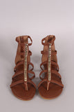 This edgy sandal features an elasticized straps design, center metallic ornament embellishment, lightly padded insole, and rear zipper closure for easy on/off.