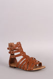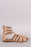This flat sandal features an open toe silhouette, strappy construction with adjustable buckles accents, and low stacked heel. Finished with lightly padded insole and convenient back zip closure.