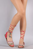 These Lace up design. The strap across the vamp features a multi print design with three braided crossing straps.