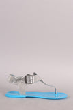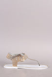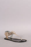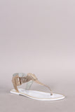 This flat sandal features a t-strap construction, metallic snake embossed design upper, metallic trim along the edge, and adjustable ankle strap with buckle closure.