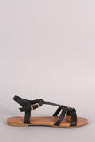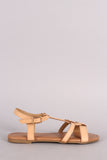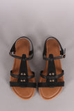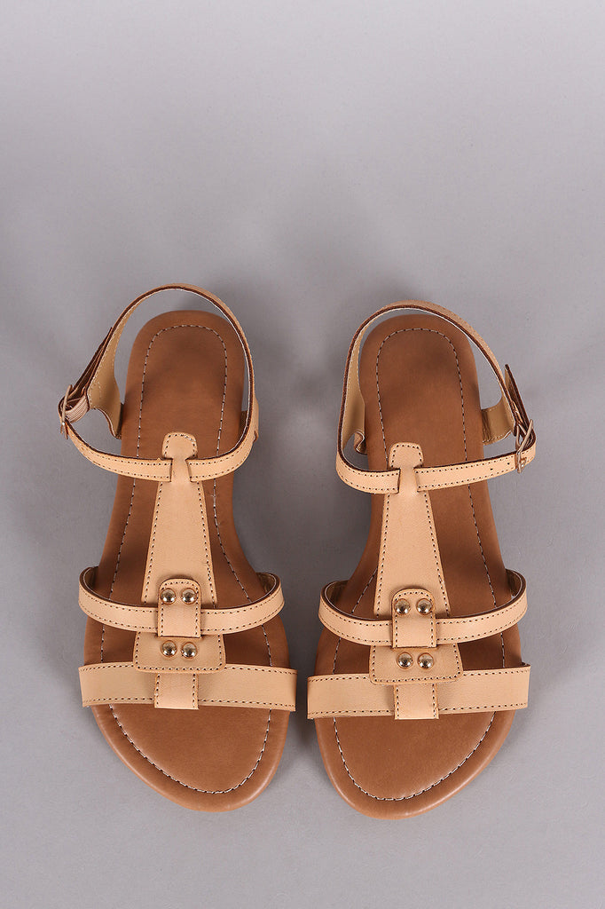 This flat sandal has woven straps crossing the toe box, gold tone studs, featuring a t-strap band with an adjustable ankle strap.