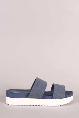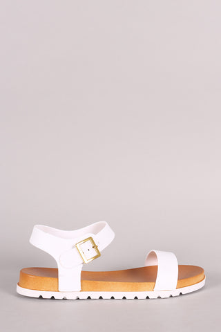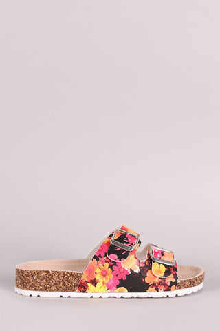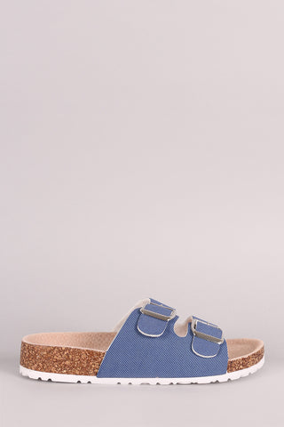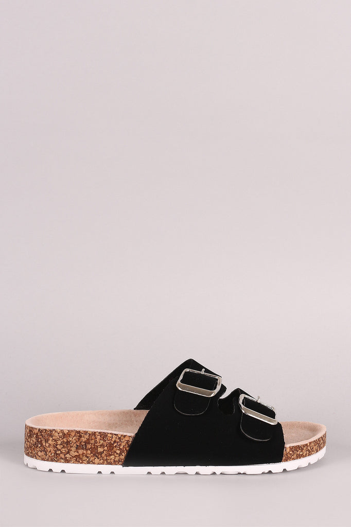 This sandal features a nubuck upper, open toe silhoutte, dual band straps with buckles accent, cork midsole, and easy slip-on style.