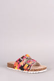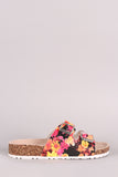 This sandal features a floral print on vegan leather upper, dual band straps with buckles accent, open toe, cork midsole, and easy slip-on style.