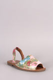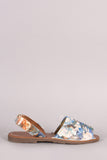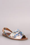 This flat sandal features iridescent snake texture fabric upper, floral print design, open toe silhouette, and easy slip-on with slingback closure.