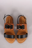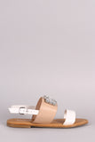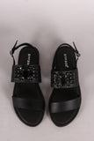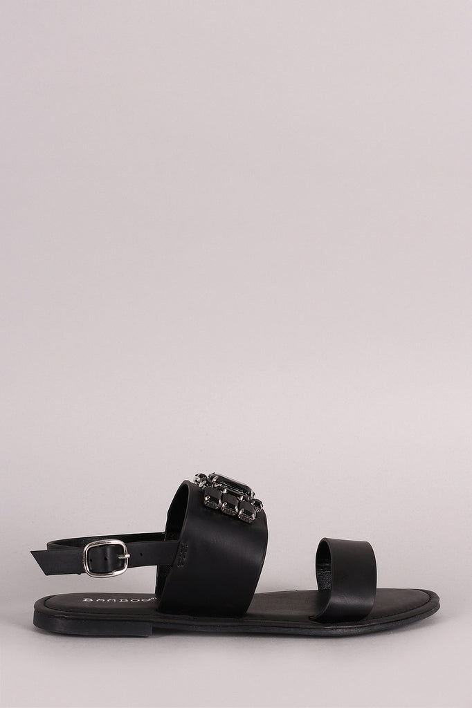 This flat sandal features double band across vamp, open toe silhouette, rhinestones design, and slingback construction with side buckle closure. Finished with a lightly padded insole for comfort.