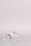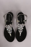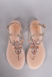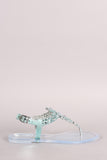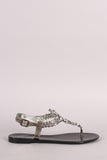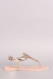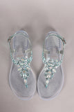 This dazzling thong flat sandal features metallic vegan leather straps, a t-strap design with jewel accents, jelly insole, and adjustable slingback strap with buckle fastening.