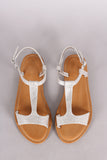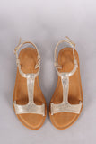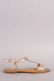 This open toe flat sandal features a T-strap construction, lightly padded insole, and adjustable ankle strap with buckle fastening.