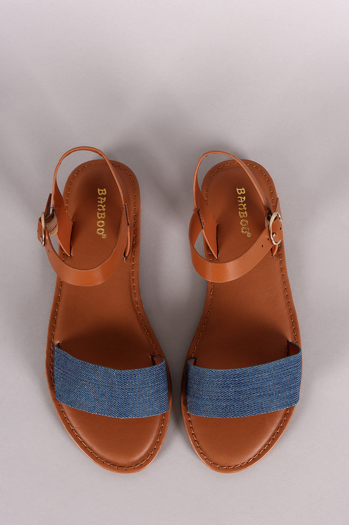 This flat sandal features one denim upper band across vamp, and an ankle strap with an adjustable side buckle closure. Finished with a lightly padded insole.