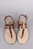 This edgy flat sandal features a T-strap construction with metallic square ornament embellishment, leopard printed strap, and metal zigzag trims along the edge. Finished with a lightly padded insole, slight heel, and adjustable slingback strap with buckle fastening.