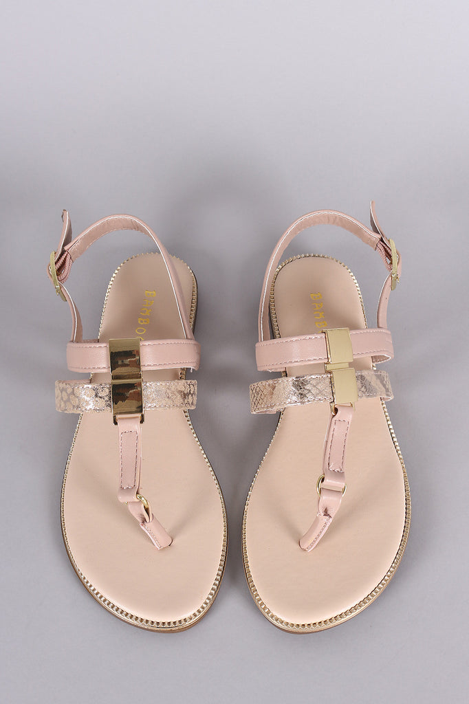 This edgy flat sandal features a T-strap construction with metallic square ornament embellishment, snake print hologram vegan leather strap, and metal zigzag trims along the edge. Finished with a lightly padded insole, slight heel, and adjustable slingback strap with buckle fastening.