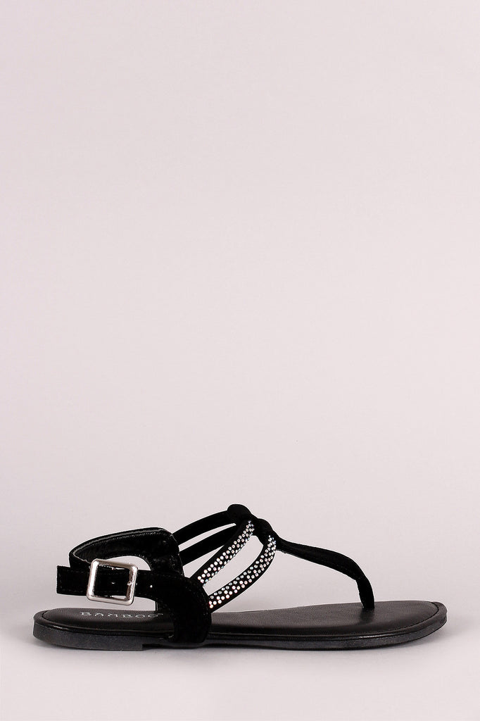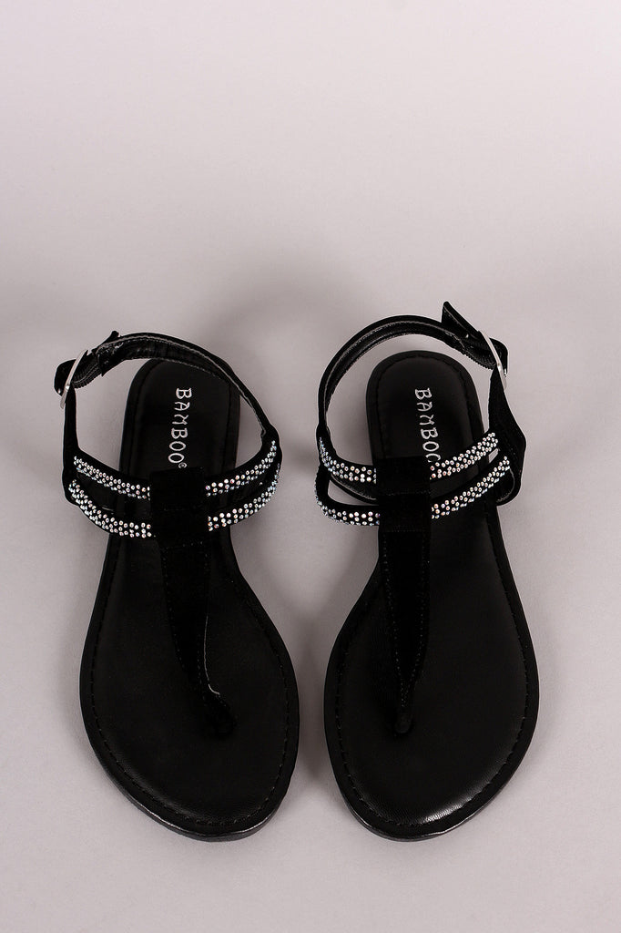 This stylish thong flat sandal features a T-strap construction, rhinestone strap embelishments, lightly padded insole, and adjustable side buckle closure.