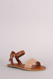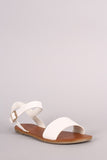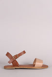 This lightweight flat sandal features an open toe silhouette, one band across vamp, lightly padded insole, and adjustable ankle strap with buckle fastening.