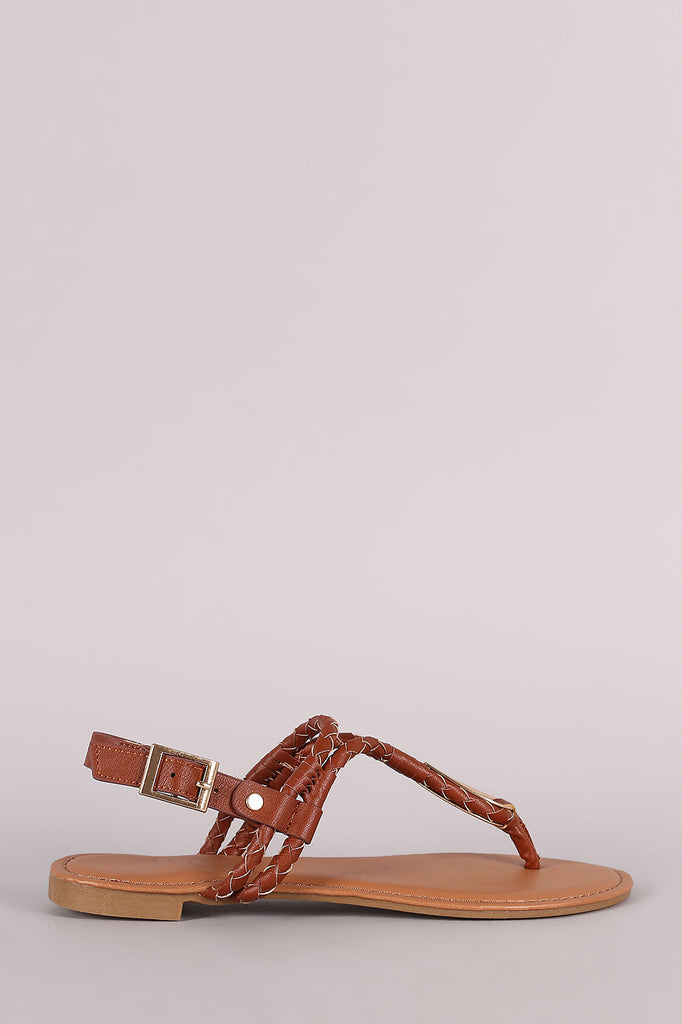 This thong flat sandal features a T-strap construction, metallic tear drop ornament, braided vegan leather straps, lightly padded insole, and adjustable ankle strap with buckle fastening.