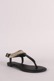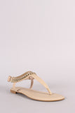 This flat sandal features a T-strap construction, metallic ornament with sparkling rhinestone accents, lightly padded insole, and adjustable ankle strap with buckle fastening.