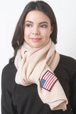 This scarf features soft knit, mixed patches, and stripes. 100% Acrylic.