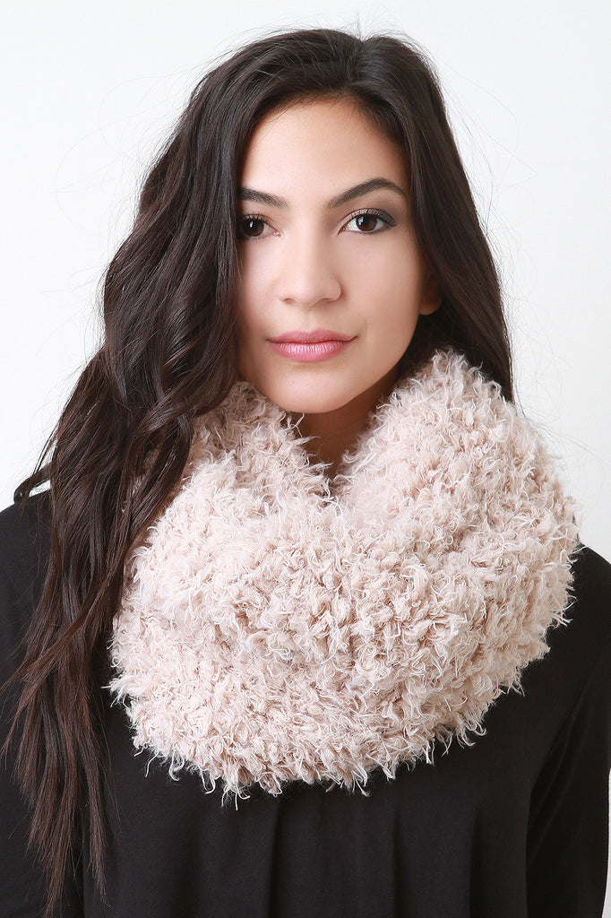 A twisted mobius infinity scarf in soft faux shearling. 100% Acrylic.