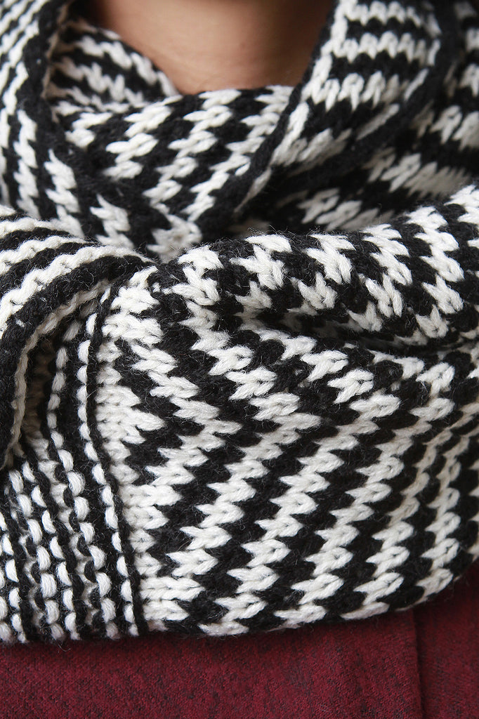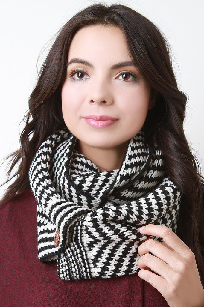 This uniquely patterned scarf features a thick, wale knit fabrication and three faux wooden buttons for closure.