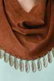 This cute scarf features vegan suede, embossed metallic feather charms, and self-tie back.