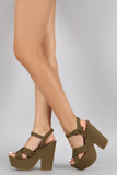 This platform and chunky heel. Features a slingback strap that forms with an adjustable ankle strap. Finished with two crossing straps on the upper vamp.