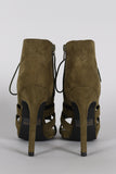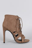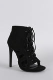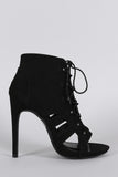 These booties are on leg lengthening stiletto heel. Designed with a corset lace up and a strappy peek-a-boo cage along the sides. Finished with a side zipper for easy on-off wear.
