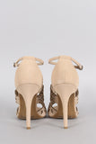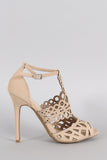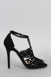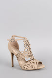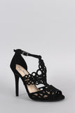 This beautiful heel features an intricate laser cutouts detail, peep toe silhouette, single sole, and wrapped stiletto heel. Finished with lightly padded insole and adjustable ankle strap with buckle fastening.