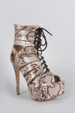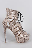 This stunning python print vegan leather throughout, peep toe silhouette, caged design vamp, and corset style lace up detail. Finished with wrapped platform, stiletto heel, lightly padded insole, and rear zipper closure for easy on/off.