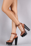 This stylish heel features vegan leather upper, strappy vamp, ankle strap with buckle closure, lug sole platform, and chunky heel. Finished with lightly padded insole.