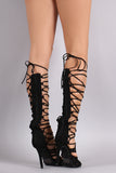 This striking heel features a peep toe silhouette, strappy construction with lace up front design, and wrapped stiletto heel. Finished with lightly padded insole and convenient back-zip closure.