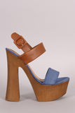 This unique denim print nubuck/vegan leather upper, open toe silhouette, and adjustable slingback strap with buckle fastening. Finished with faux wooden platform, spool heel, and lightly padded insole for comfort.