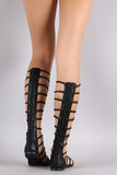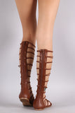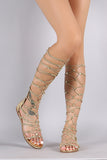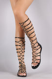 This flat sandal features an elasticized straps design shaft with metal hardware embellishment, open toe silhouette, lightly padded insole, and convenient back-zip closure.