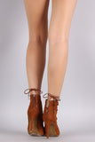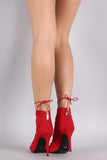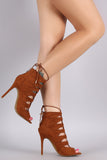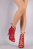 This hot stiletto heel features a strappy caged design with corset lace-up closure, peep toe silhouette, and wrapped stiletto heel. Finished with a back zip-up closure for convenience, and stitched detail design.
