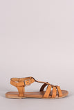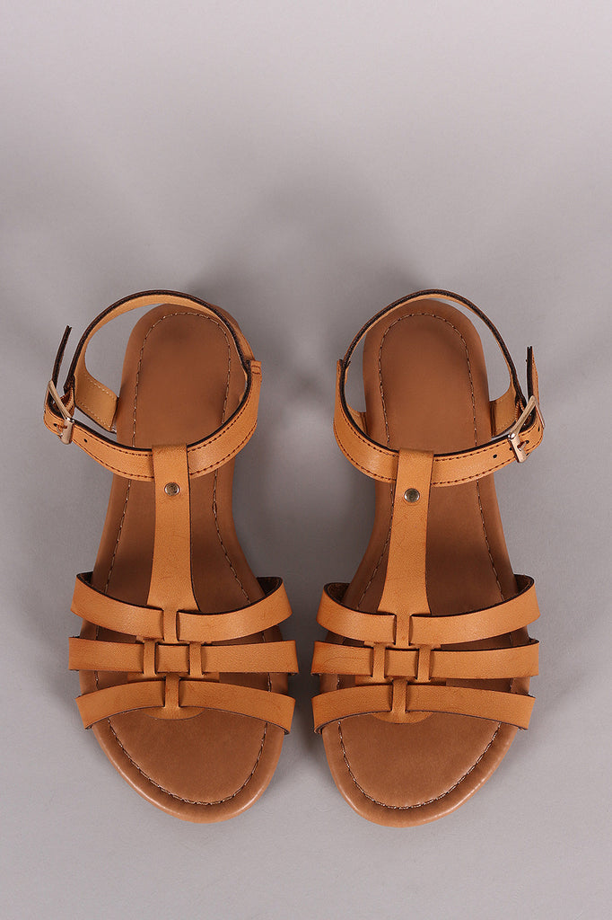 This flat sandal has woven straps crossing the toe box, featuring a t-strap band with an adjustable ankle strap.
