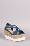 This stylish flatform wedge features an open toe silhouette, asymmetrical straps denim upper, woven faux straw midsole, slingback construction and lug sole. Finished with a lightly padded insole for comfort and side buckle closure.