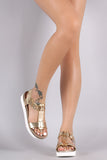 This open toe sandal is flatform silhouette with a cushioned sole. T-strap design featuring a metallic hardware along the adjustable ankle strap.