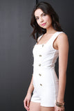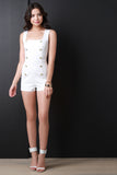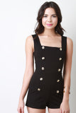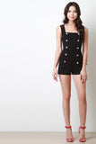 This sleeveless romper features a square neckline, non functional double breasted button-up design, high waisted seams, short bottom, and back-zip closure. Accessories sold separately. Made in U.S.A. 65% Rayon, 30% Nylon, 5% Spandex.