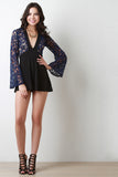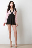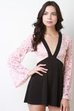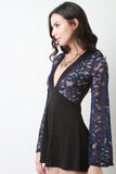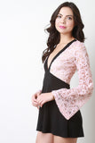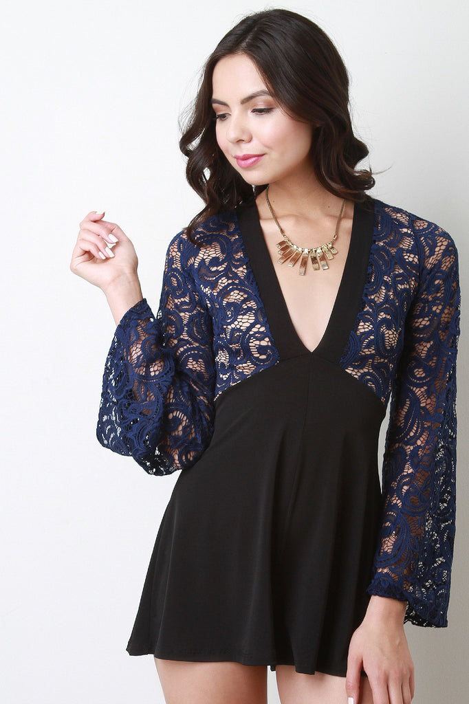 This combo lace upper half with front lining, plunging v-neckline, long bell sleeves, empire waist cinched seam, and contrasting flutter shorts. Accessories sold separately. Made in U.S.A. 92% Nylon, 8% Spandex. Contrast: 95% Polyester, 5% Spandex.