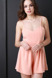 This fun romper features a pleated bodice, flutter shorts, V neckline, spaghetti straps, and an invisible zipper closure. Accessories sold separately. 100% Polyester.