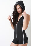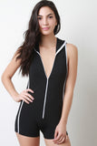 This sporty romper features a full front zipper front for easy access, hoodie back, and sleeveless construction. Finished with bodycon shorts. Accessories sold separately. Made in U.S.A. 48% Rayon, 48% Polyester, 4% Spandex.