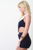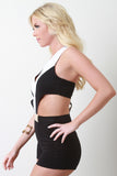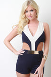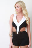 This edgy romper features a colorblock knit fabrication, caged cutout designs, v-neck with exposed back zipper closure, metallic shield accent at waist, and fitted short bottom half. Accessories sold separately. Made in U.S.A. 67% Viscose, 28% Nylon, 5% Spandex.