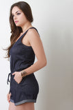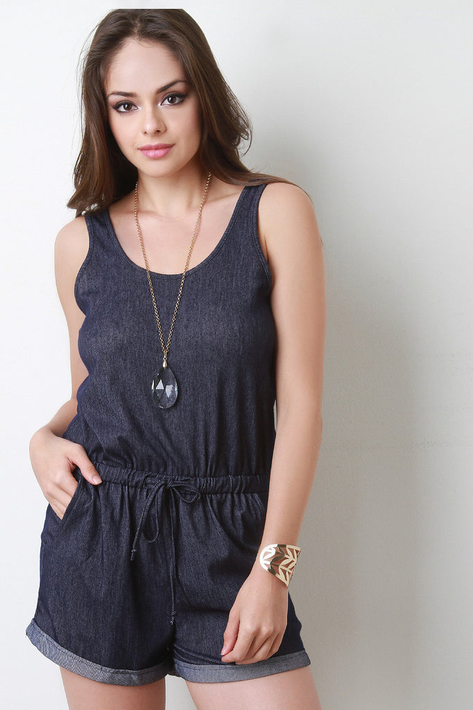 This lovely sleeveless denim throughout, scooped neck, elasticized waistline with adjustable drawstring, two side pockets, and cuffed hem shorts. Accessories sold separately. 92% Polyester, 8% Spandex.