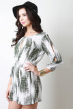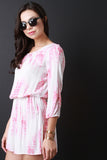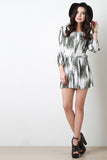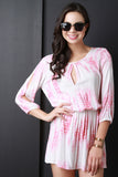This boho inspired romper features a tie dye woven fabrication , rounded neckline, gathering detail, elastic waist, three quarter sleeve with slits, loose fit short, finished with a back key hole with button at nape. Accessories sold separately. Made in U.S.A. 100% Rayon.