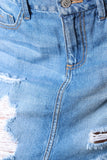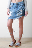 This medium wash denim skirt features belt loops, zipper fly to a single button closure and 5-pockets. Finished with ripped designs in the front, frayed and an asymmetrical hemline. Accessories sold separately. 100% Cotton.