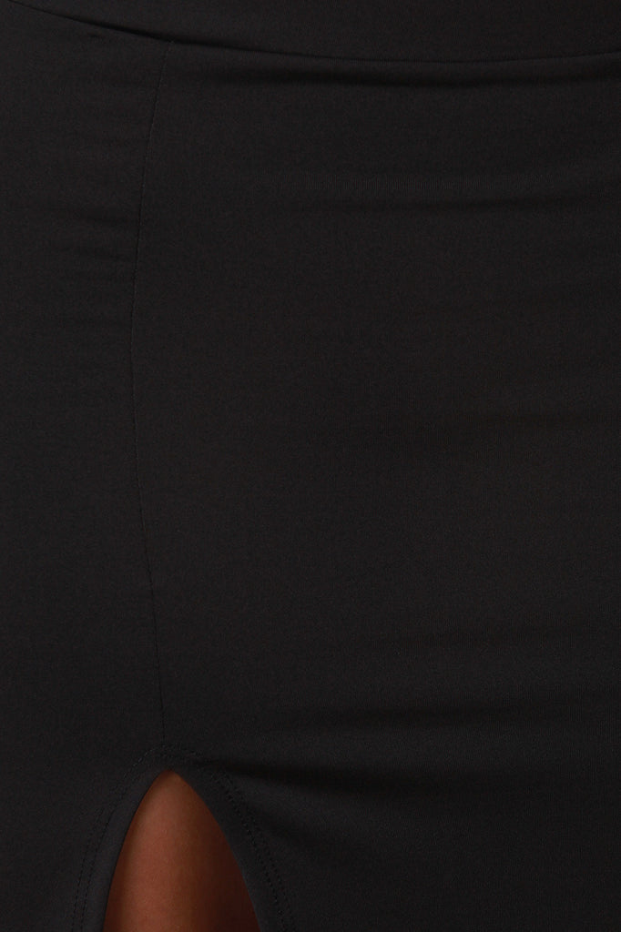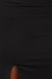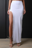 This skirt features a soft stretchy knit fabrication, and elasticized waistband. Finished with a side slit, and maxi length hemline. Accessories sold separately. Made in U.S.A. 95% Polyester, 5% Spandex.