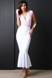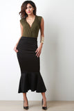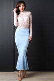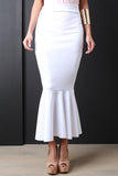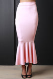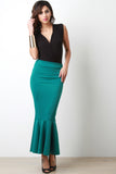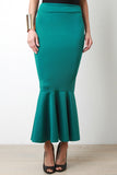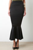 This maxi skirt features a high waisted design with wide panel seam, stretchy sculpture fit, and mermaid flare hemline. Accessories sold separately. Made in U.S.A. 90% Polyester, 10% Spandex.